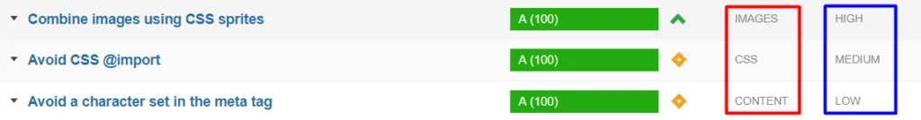 Araç siteyi performans konusunda sıkı bir testten geçiriyor ve raporda (ücretsiz versiyonu dahil) hepsini gösteriyor. Siteniz ile alakalı sunduğu raporda incelemelerini TYPE ve PRIORITY olarak ikiye ayırıyor. TYPE, performansın ne ile alakalı olduğunu, PRIORITY ise önem derecesini belirtiyor.